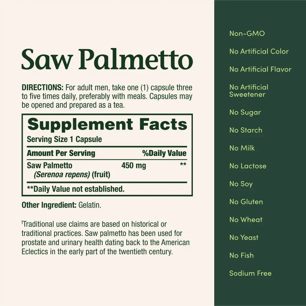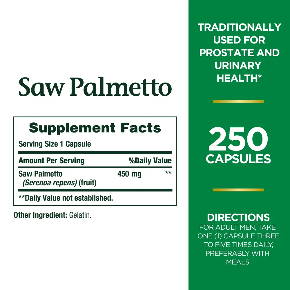 Nature’s Bounty Saw Palmetto is one of the leading herbs for men’s health, especially in later years. It has been traditionally used to support prostate and urinary health. Adult men can take one capsule three to five times daily, preferably with meals, to help support prostate and urinary health. For 50 years, Nature’s Bounty has blended the best of nature with the latest in science and nutritional innovation. Traditional herbs help provide support for living a healthier life. Nature’s Bounty Saw Palmetto is Non-GMO, No Artificial Color, No Artificial Flavor, No Artificial Sweetener, No Sugar, No Starch, No Milk, No Lactose, No Soy, No Gluten, No Wheat, No Yeast, No Fish and Sodium Free.